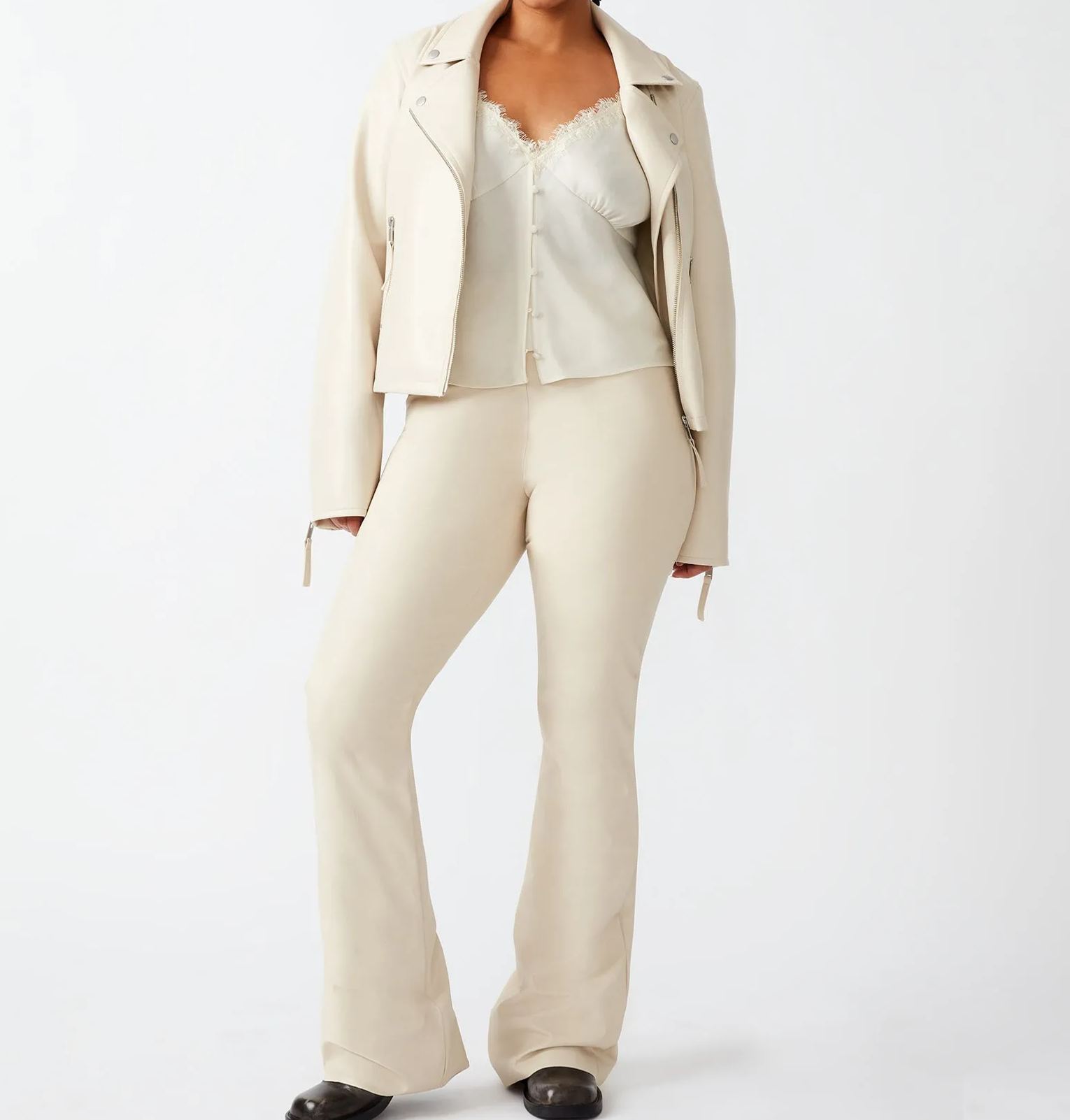 Flared faux leather features stretch fabric, pull-on construction, and lining for a seamless look that's super durable.