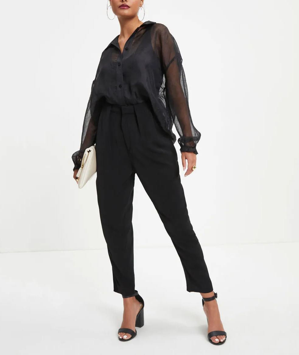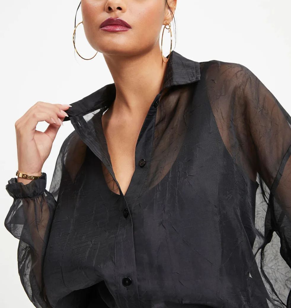 Classic meets chic in the Organza Button Down Top in black that features front button closures.